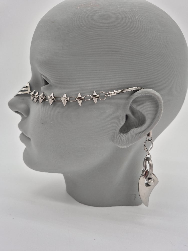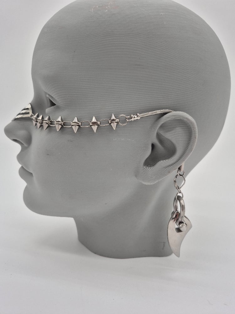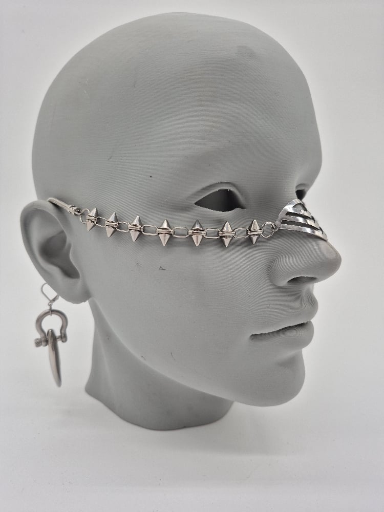 This piece blends feral grace & armor aesthetics, featuring signature iLit Designs sculpted nose bridge, sleek cheekbone framing chains, and removable spiked earring gauges that shift effortlessly between battle mode and ceremonial glam.