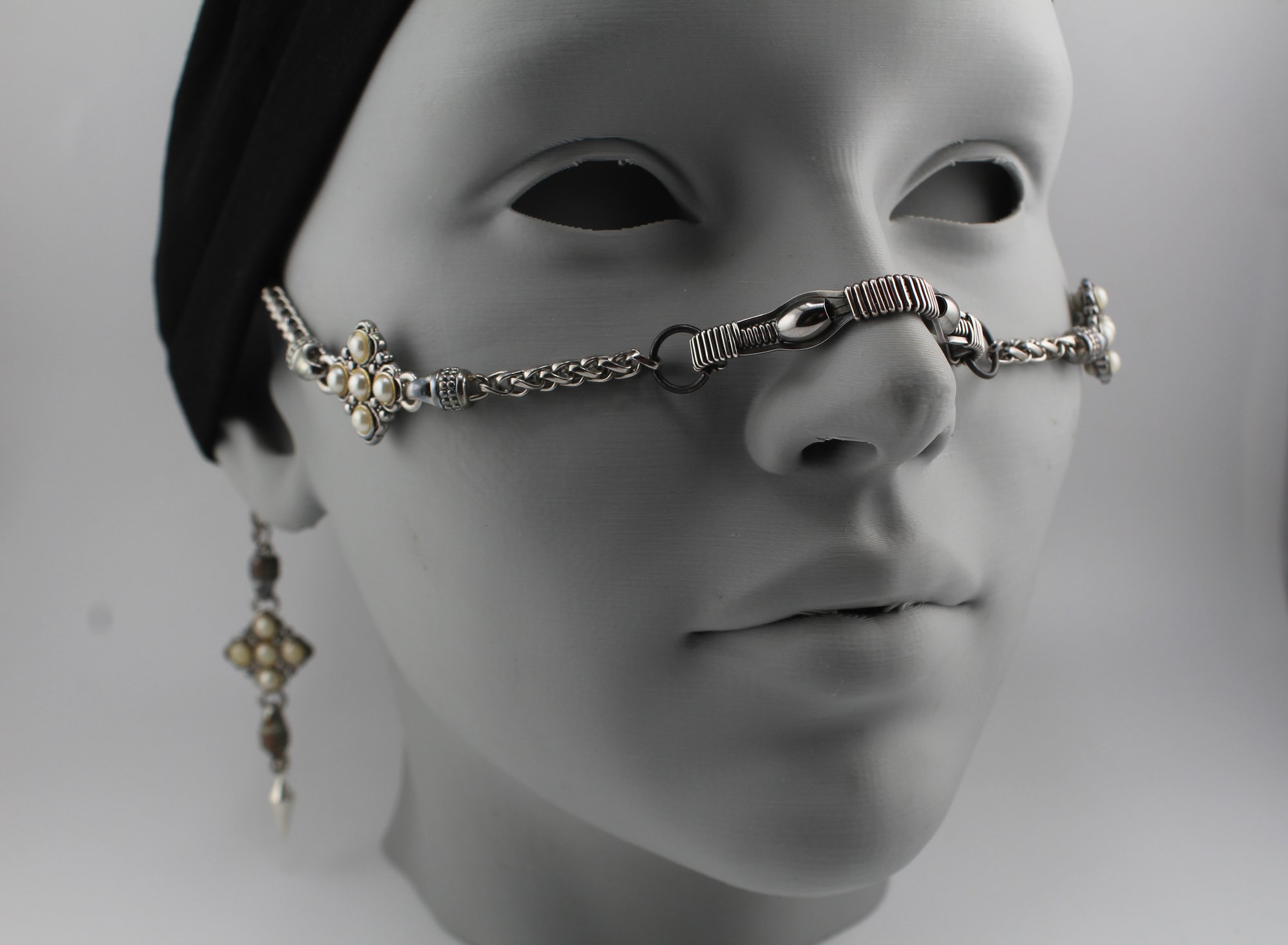 This one piece, one-of-a-kind vintage chain centers a uniquely crafted nose piece by Rigz Blackford and pearly accented cheekbone components.